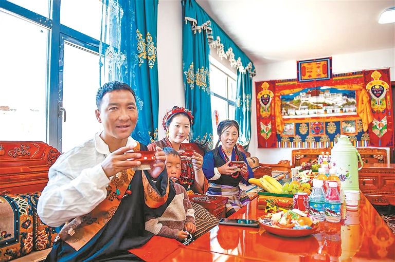 图为定结县乃村村民在喝新房里的第一杯酥油茶。记者 旦增嘎瓦 摄