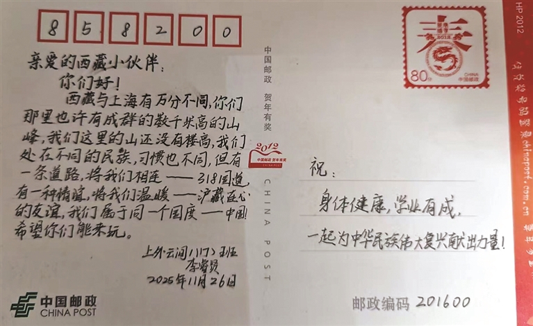 “看到上海的美景和真诚的祝福,我很激动。我在回信里邀请他来我家做客,体验西藏风情。”学生卓玛高兴地说。这小小的明信片,承载着深情厚谊,也为促进各民族交往交流交融搭建了心灵桥梁。