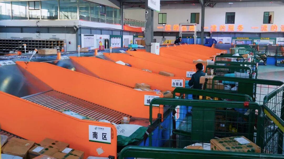 走进中国邮政集团日喀则分公司邮件处理中心,几十辆大小不一的车辆停满院落,工人们正忙着卸货。智能分拣设备快速运转,包裹按县区精准归类,再分别装车,分拣车厢里一派繁忙。
