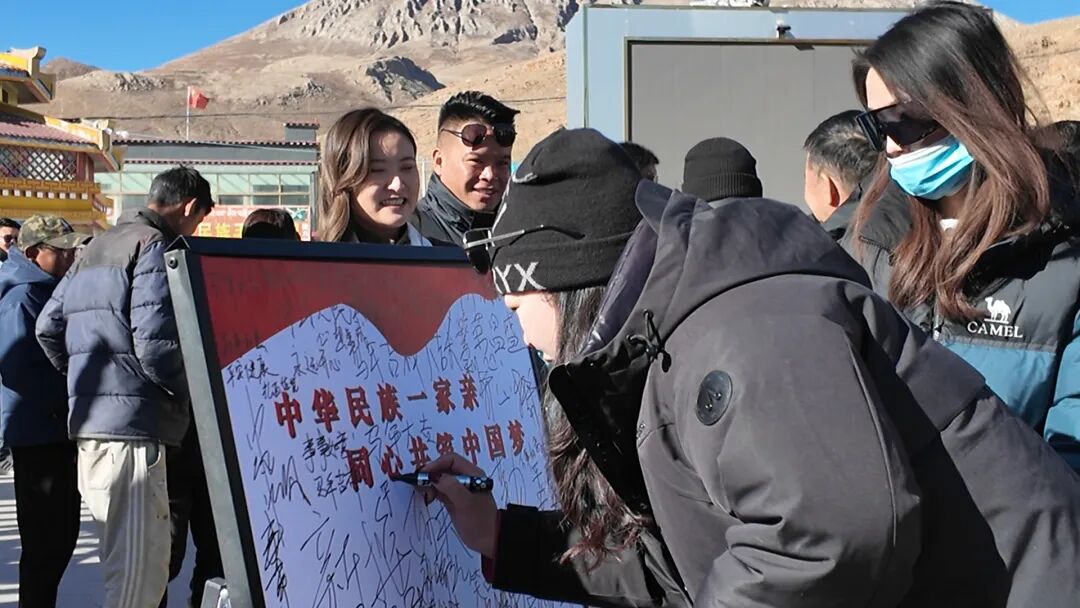 第一次来到西藏的游客罗文婷,特意带着儿子踏上高原之旅,恰逢春节与藏历新年,让这次旅途更添意义。在强公村,她不仅品尝了醇香的青稞酒、酸甜的酸奶奶棒、浓郁的甜茶等特色美食,还在祝福书写点认真写下了“藏汉一家亲”五个字。“这是我第一次来高原过春节,原本只是沿318国道自驾旅行,没想到能和当地乡亲们一起感受这么浓厚的年味。”乡亲们淳朴热情的笑容更让她倍感温暖,而“藏汉一家亲”,正是她此行最真实、最深刻的感受。