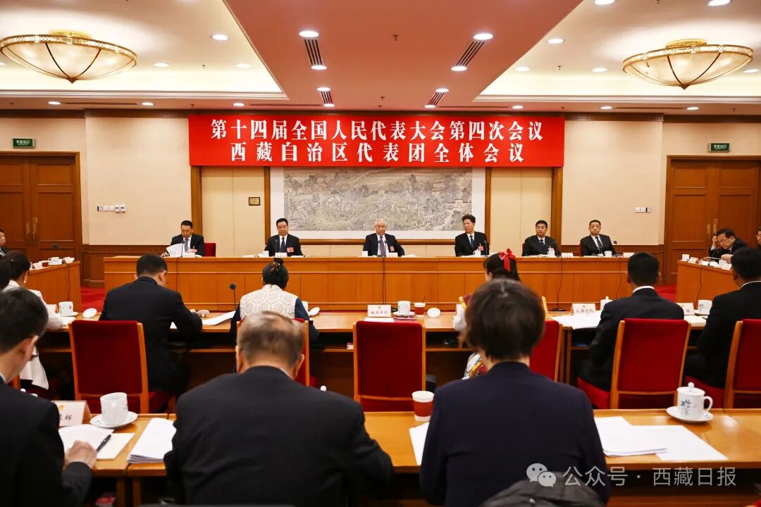 3月6日,西藏代表团举行全体会议,传达学习习近平总书记在参加十四届全国人大四次会议江苏代表团审议时的重要讲话精神,审议政府工作报告、审查“十五五”规划纲要草案。