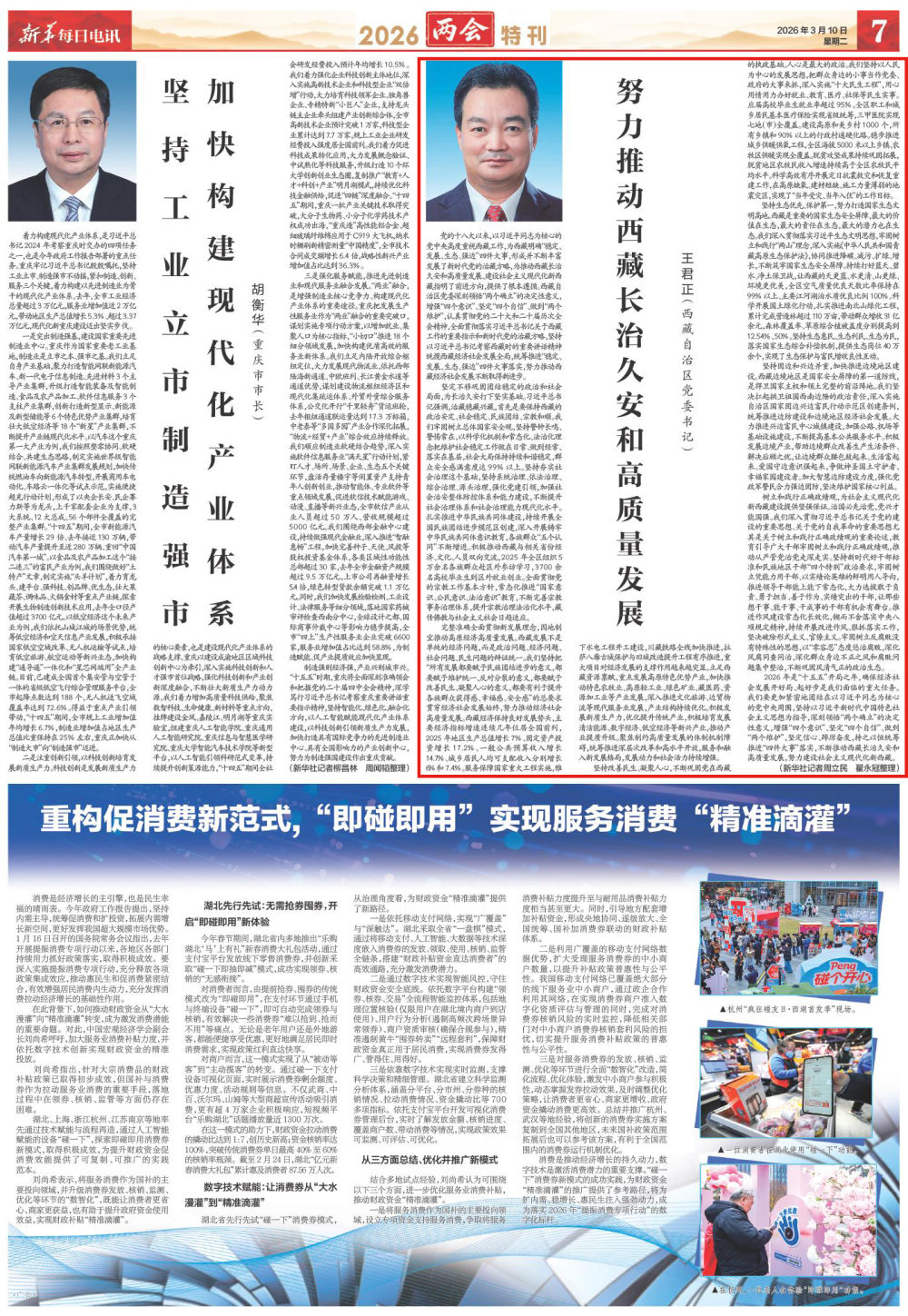 完整准确全面贯彻新发展理念,因地制宜推动高原经济高质量发展。西藏发展不是单纯的经济问题,而是政治问题、经济问题、社会问题、民生问题的辩证统一。我们坚持把“所有发展都要赋予民族团结进步的意义,都要赋予维护统一、反对分裂的意义,都要赋予改善民生、凝聚人心的意义,都要有利于提升各族群众获得感、幸福感、安全感”的总要求贯穿经济社会发展始终,努力推动经济社会高质量发展。西藏经济保持良好发展势头,主要经济指标增速连续几年位居全国前列,2025年地区生产总值增长7%、固定资产投资增长17.2%、一般公共预算收入增长14.7%、城乡居民人均可支配收入分别增长6%和7.4%。服务保障国家重大工程实施,雅下水电工程开工建设,川藏铁路全线加快推进,拉萨八廓古城保护与旧城改造提升工程有序推进,重大项目对经济发展的支撑作用越来越突显。立足西藏资源禀赋,重点发展高原特色优势产业,加快推动特色农牧业、高原轻工业、绿色矿业、藏医药、资源加工业等产业发展,深入推进文化旅游、边贸物流等现代服务业发展,产业结构持续优化。积极发展新质生产力,优化提升传统产业,积极培育发展清洁能源、数字经济、低空经济等新兴产业,推动产业提质升级。聚焦制约高质量发展的体制机制障碍,统筹推进深层次改革和高水平开放,服务和融入新发展格局,发展动力和社会活力持续增强。