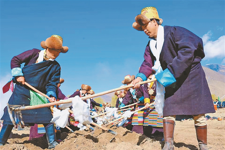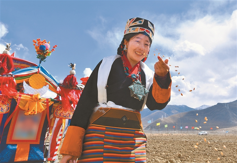 在纳木那尼峰下、孔雀河畔,阿里地区普兰县多油村群众身着节日盛装举行传统春播仪式,以传统民俗开启新一年农耕生产。