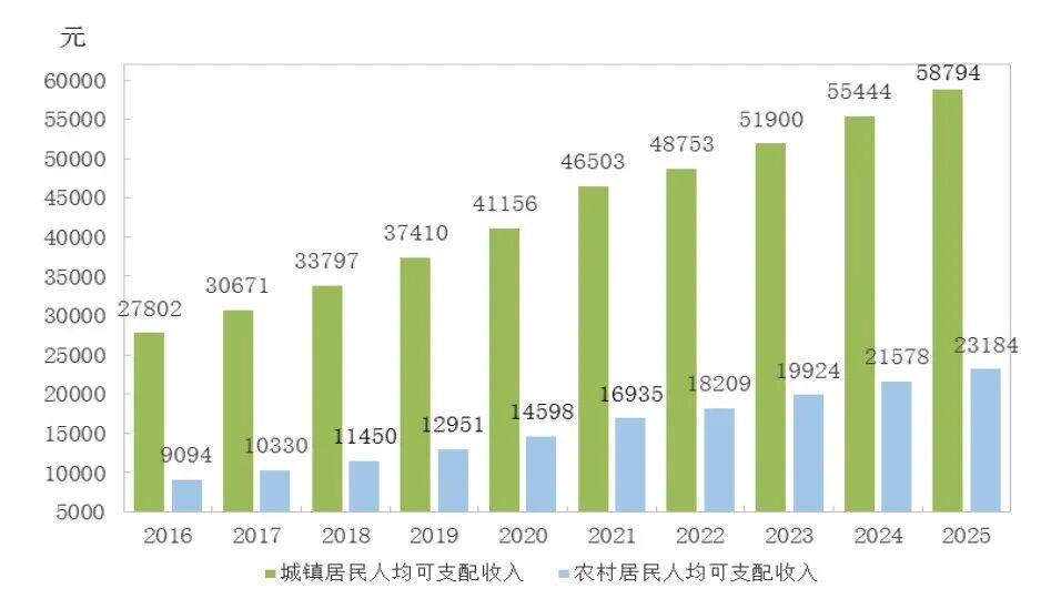 图12 2016-2025年城乡居民人均可支配收入