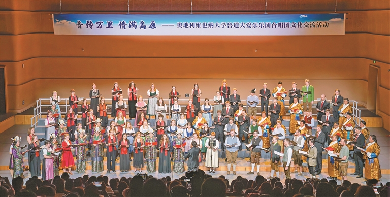 4月3日晚,西藏大剧院内歌声迭起、暖意涌动。由自治区党委宣传部、自治区外事办公室、自治区文化和旅游厅主办,自治区对外文化交流协会和自治区歌舞团承办的奥地利维也纳大学鲁道夫爱乐乐团合唱团文化交流活动在此举行。这是中奥两国艺术家在雪域高原的首次音乐对话,更是西藏与世界深情相拥的生动缩影。