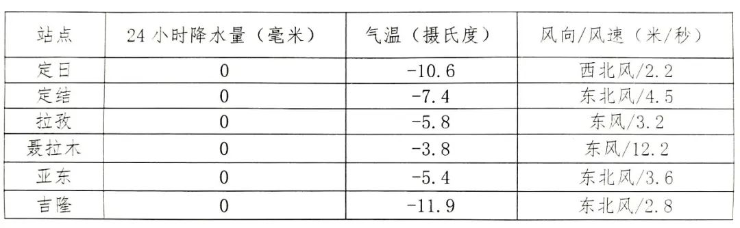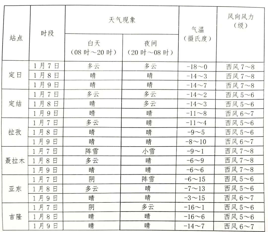 1月7~8日凌晨,震区(北纬28.50度,东经87.45度)及周边以多云转少云天气为主,吉隆-聂拉木-定结-亚东一线阴天转多云,南部个别乡镇有阵雪(雨),各地有4~8摄氏度降温,1月8白天~9日震区及周边晴天间少云;午后有7~8级大风。