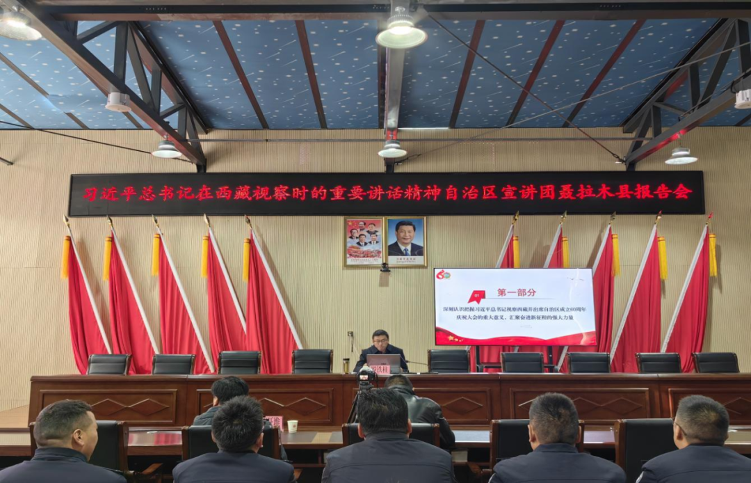 西藏自治区党委宣传部政研室主任罗铁柱围绕“共建中华民族共同体 书写美丽西藏新篇章 为全面建设社会主义现代化新西藏贡献力量”主题,从“深刻认识把握习近平总书记视察西藏并出席自治区成立60周年庆祝大会的重大意义,汇聚奋进新征程的强大力量”“以习近平同志为核心的党中央推动西藏各项事业取得的历史性成就中感悟真理力量和实践伟力,坚定不移听党话、跟党走的信心与决心”“坚持以习近平总书记在西藏视察时的重要讲话精神统揽工作全局,开创长治久安和高质量发展新局面”等三个方面进行了详细解读。宣讲报告主题鲜明、内容丰富、系统全面,具有很强的针对性、指导性和启发性。与会同志纷纷表示深受启发,倍感振奋。
