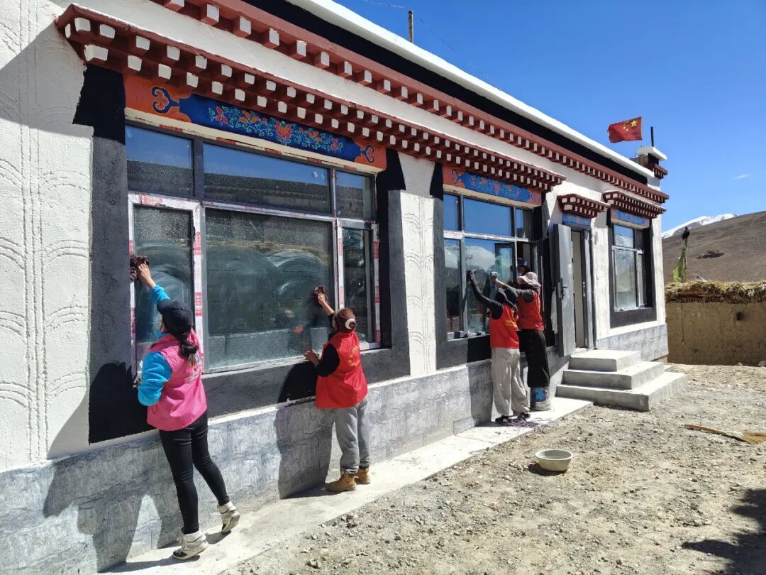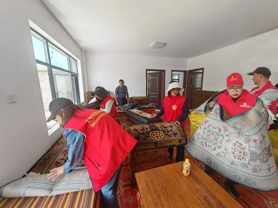 小伙子们负责体力活,扛家具、搬粮食、爬上爬下为新家安装香布;姑娘们则心思细腻,帮忙擦拭窗户、铺设卡垫、悬挂领袖像。志愿者洛追爬到房顶,为新房挂上了一面鲜艳的五星红旗。边巴普赤老人在院子里看着志愿者们忙前忙后,眼里满是感激,嘴里重复着:“呀咕嘟,呀咕嘟!”