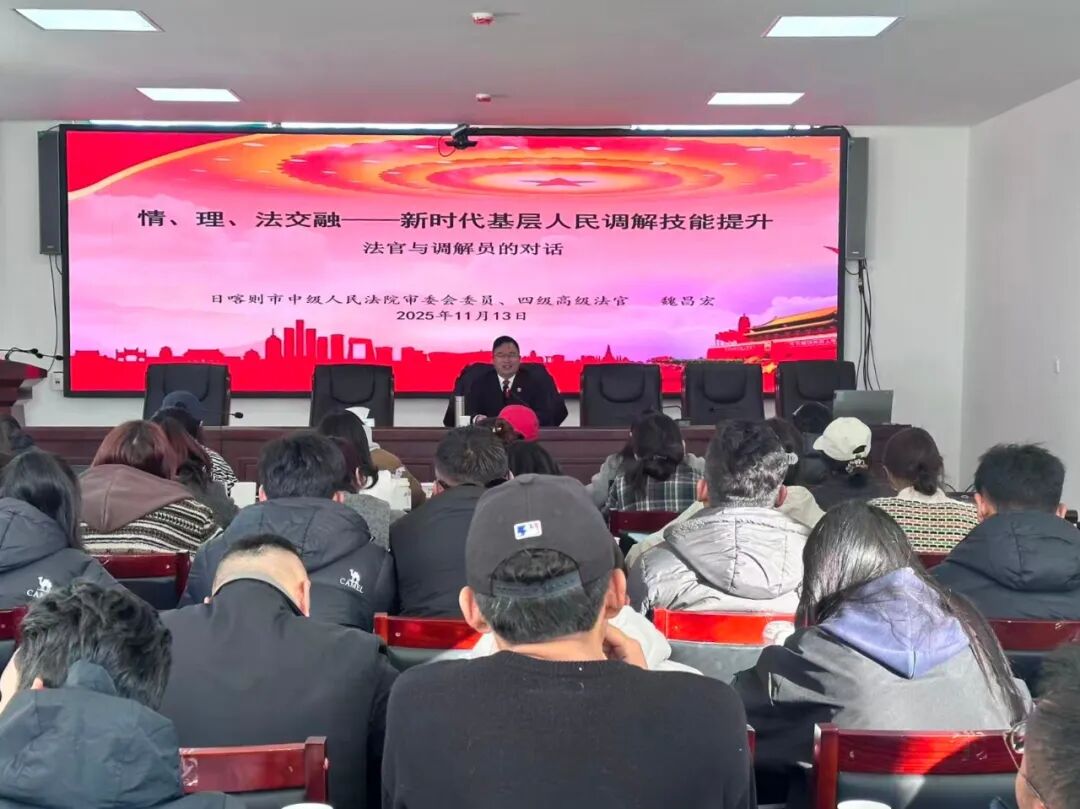 为深化矛盾纠纷多元化解工作,提升人民调解员专业素养和调解能力,落实人民法院指导人民调解法定职能,推动调解资源与司法力量深度协同,筑牢矛盾纠纷化解“第一道防线”。11月13日,日喀则市中级人民法院民事法官应邀在“2025年日喀则市第二期人民调解和安置帮教业务培训暨专职人民调解员能力素质提升行动培训班”上为全市基层人民调解员培训授课,全市18县区64名基层人民调解员参加培训。