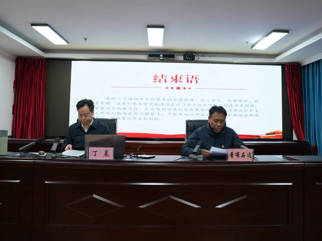 11月20日,学习贯彻党的二十届四中全会精神自治区宣讲团报告会在白朗县召开。自治区党委统战部副部长丁晨作宣讲报告,县委书记普布石达主持报告会,在家县级领导、县直各部门负责同志、群众代表、师生代表、公安干警代表、医护人员代表、离退休干部代表等70余人在主会场参加会议,报告会以电视电话会议形式开至乡镇一级。