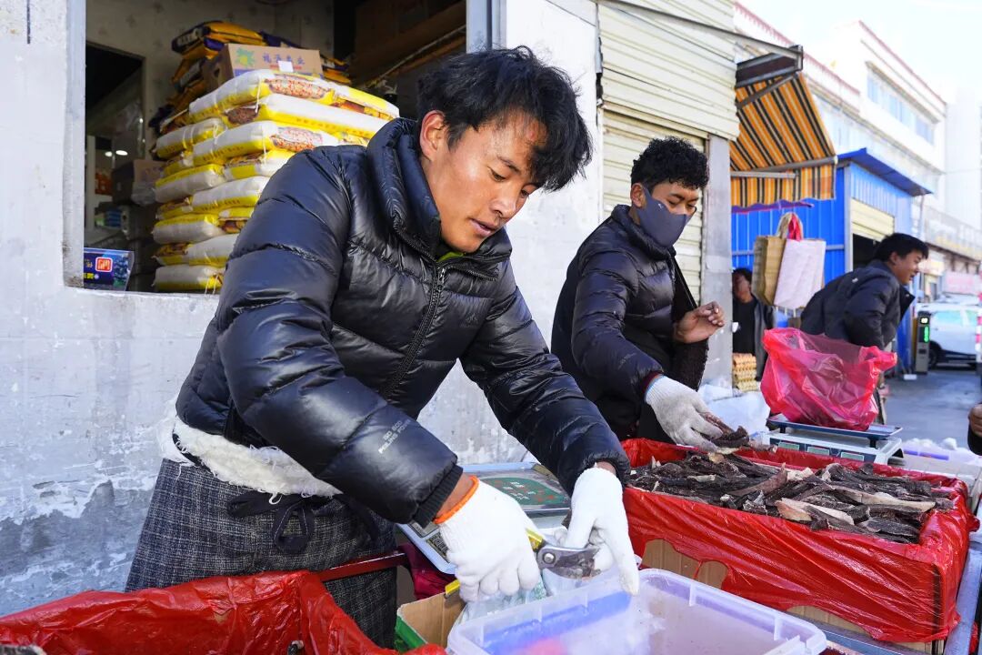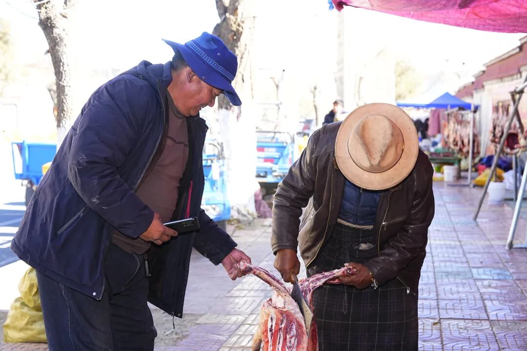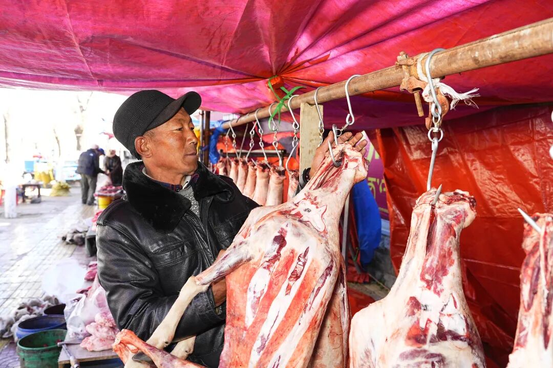 “最近买肉的人特别多,一天能卖出十来只整羊!”来自萨迦县的商户洛桑一边忙着切割羊肉,一边笑着说。据他介绍,羊肉按肉质、大小分级,整羊售价在800元到1000元不等,因肉质鲜嫩、价格实惠,深受市民青睐。
