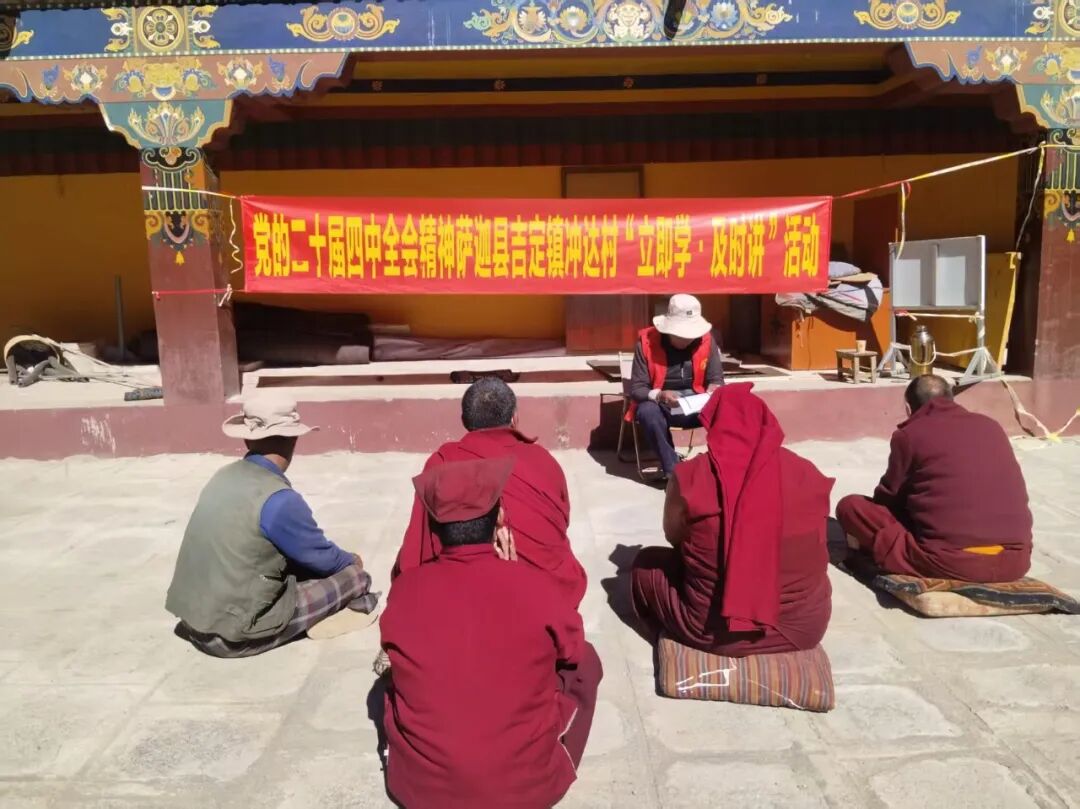 吉定镇冲达村自治区基层宣讲员走进楚布寺,开展党的二十届四中全会精神“立即学·及时讲”宣讲活动,宣讲员用拉家常的方式,深入解读党的二十届四中全会核心要义与精神实质,引导僧人深刻领会全会精神,在继承爱国爱教优良传统中铸牢中华民族共同体意识,让“五个认同”扎根思想、融入行动。