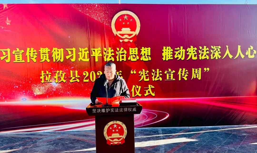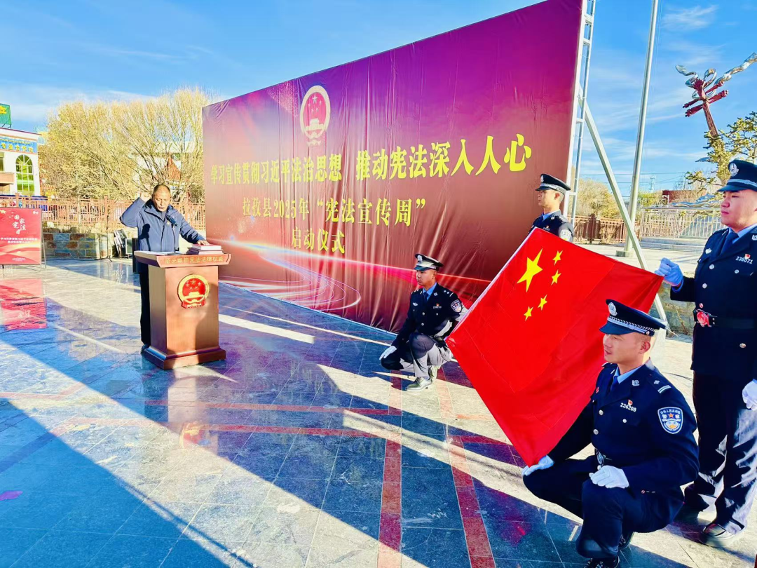 启动仪式在雄壮的国歌声中拉开帷幕。索旦在致辞中指出,党的二十届四中全会明确提出坚持依宪治国、依宪执政,为新时代法治建设工作指明了前进方向、提供了根本遵循。当前,拉孜县正处于高质量发展的关键阶段,全县各级各部门要以此次宪法宣传周为重要契机,切实扛起普法工作责任,创新宣传方式、丰富宣传内容,大力营造尊法学法守法用法的浓厚社会氛围。