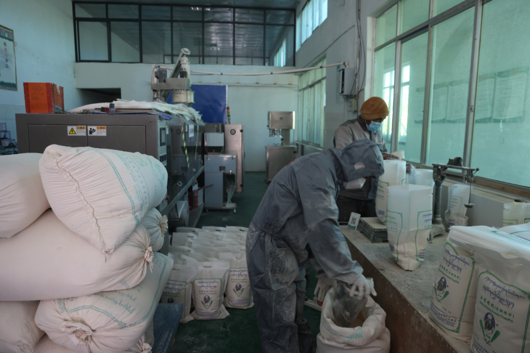 “你看,今年的青稞品质真不错,磨出的粉又细又香!”车间里的工人抓起一把青稞粉展示道。他手法娴熟地撑开布袋,对准出料口接取粉体,指尖轻拢袋口捋平褶皱,封口机按下的瞬间传来清脆声响,一袋袋封装完好的青稞粉整齐堆放在一旁。