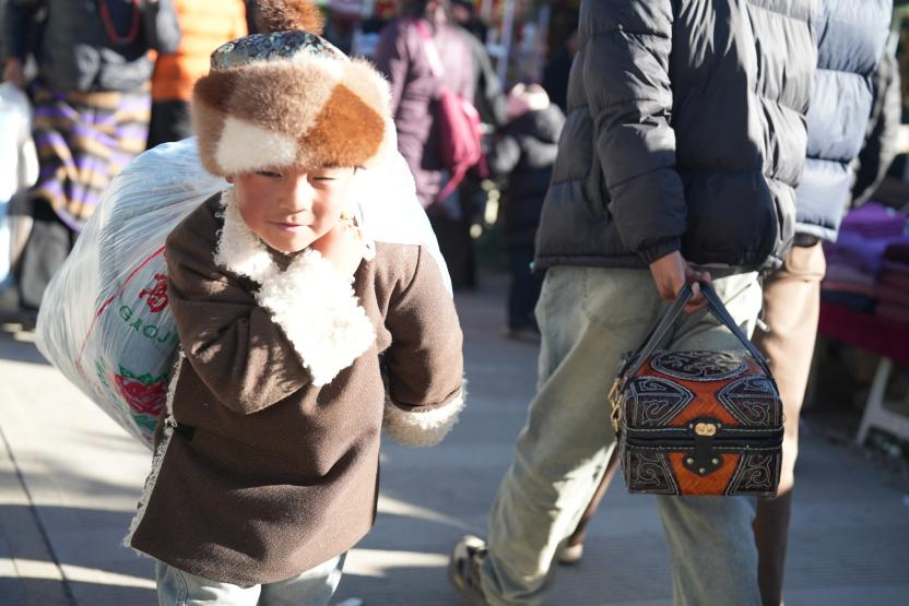 会场内外,摊主热情吆喝与顾客挑选问询声交织成市井乐章,老人细细比对品质、年轻人往来挑选、孩童追逐嬉戏,满是人间烟火气。群众肩扛手提、行囊鼓鼓,满载而归的身影随处可见:日用百货刚需满满,牛羊肉鲜香紧实,风干肉醇厚耐存,手工邦典色彩斑斓,非遗藏靴针脚细腻,件件装着对生活的热忱与欢喜。