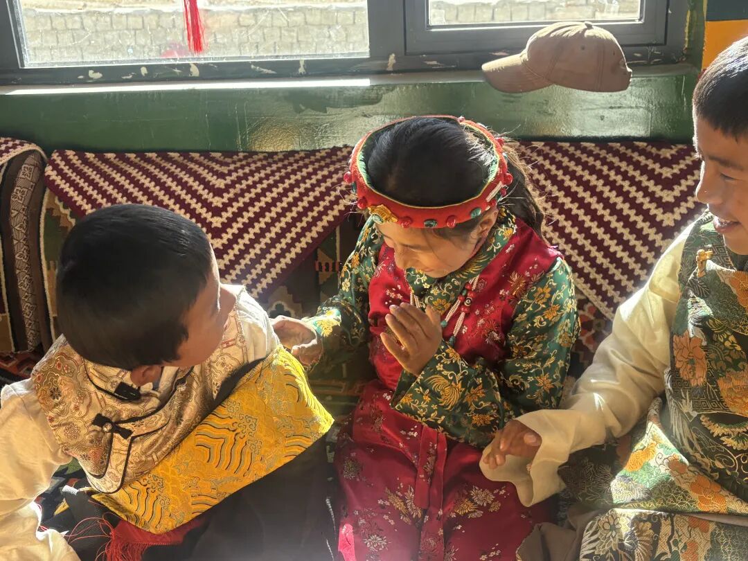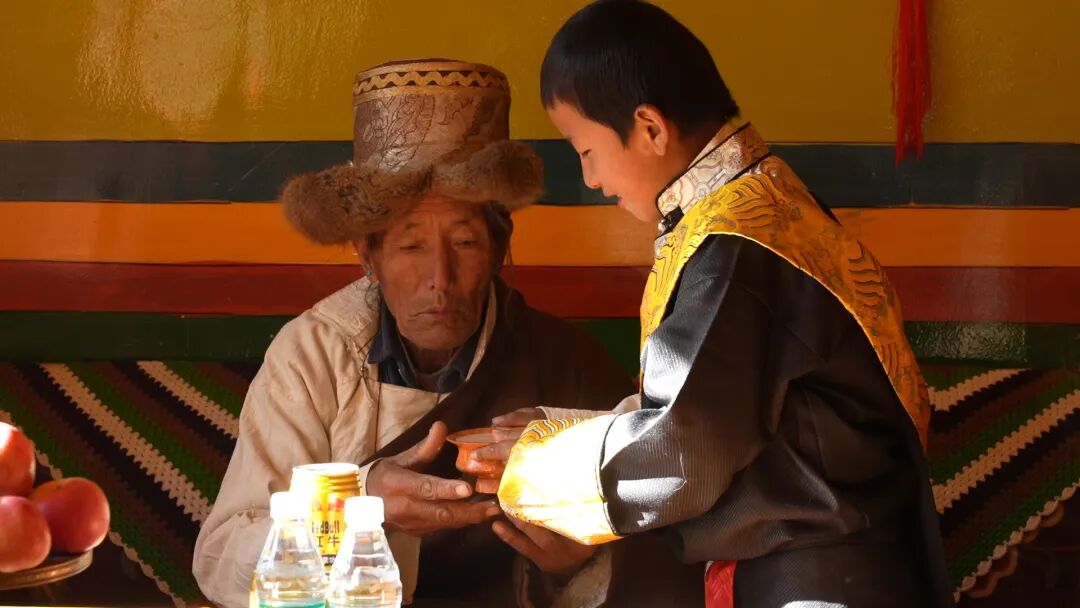 年过古稀的多布杰家喜气盈门,张灯结彩的新房里暖意融融。大儿子次旦欧珠手捧洁白哈达,虔诚地系在新房门框上,祈愿新年全家安康;二儿媳索朗卓嘎缓步登上二楼添满水缸,回到厨房在炉火旁架起茶壶准备烹煮甜茶;大儿媳次旦卓拉守在炉边添柴烧水,橘红的火光映得她脸庞格外温润,随后她搀扶着一旁的普尺奶奶穿上厚外套,慢条斯理的动作里满是细心与妥帖。另一边,多布杰的重孙辈们围在屋角,正和小奶猫一起嬉笑玩闹,清脆的笑声划破冬日的静谧。