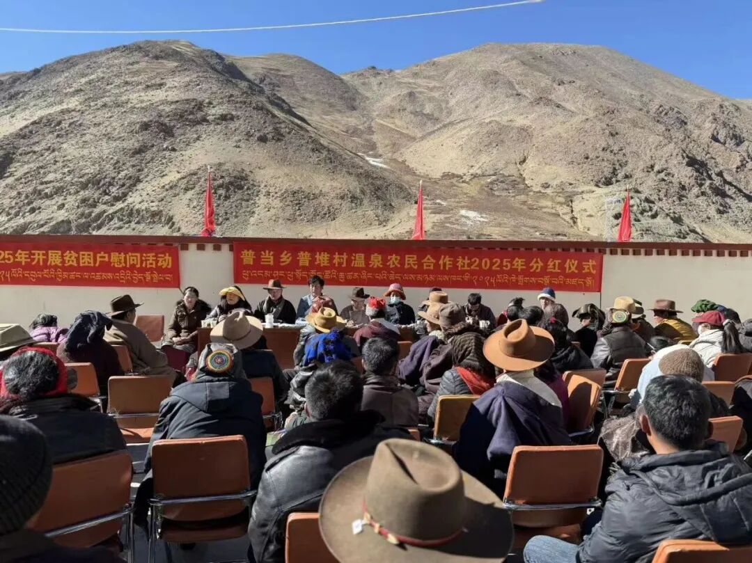 1月8日,南木林县普当乡普堆村村委会内暖意融融,普堆村温泉农民合作社分红仪式如期举行,合作社理事会成员、各成员社代表、入股群众以及各村负责人齐聚一堂,共话丰收喜悦。