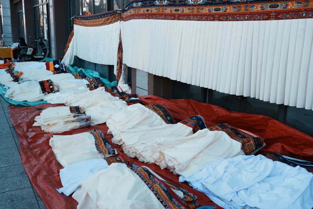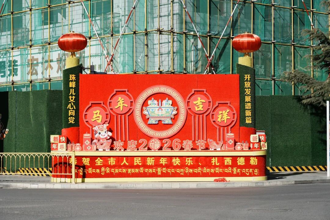 随着日喀则农事新年的脚步渐近,整座城市早已沉浸在一片喜庆祥和的节日氛围中。街头巷尾,绯红的灯笼连串高悬,随风轻曳,洒落一地温暖的光晕。沿街的窗牖与门楣,缀满了流光溢彩的吉祥饰物,金边红幅交相辉映,流转着家的温馨与年的吉兆。