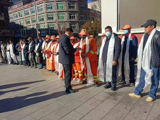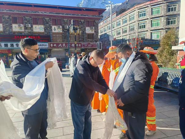 在吉隆镇慰问现场,工作人员向辖区内34名环卫工人、8名城管执法人员敬献哈达表示慰问,让冬日的户外充满温情。慰问组高度肯定了大家在守护生态底色、维护城镇秩序中的重要作用,详细询问了工作生活状况,叮嘱冬季户外作业务必做好防寒保暖与安全防护,鼓励大家持续为城镇形象提升贡献力量。