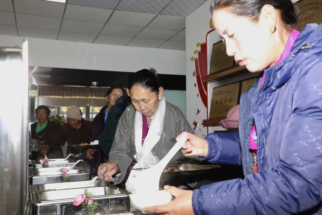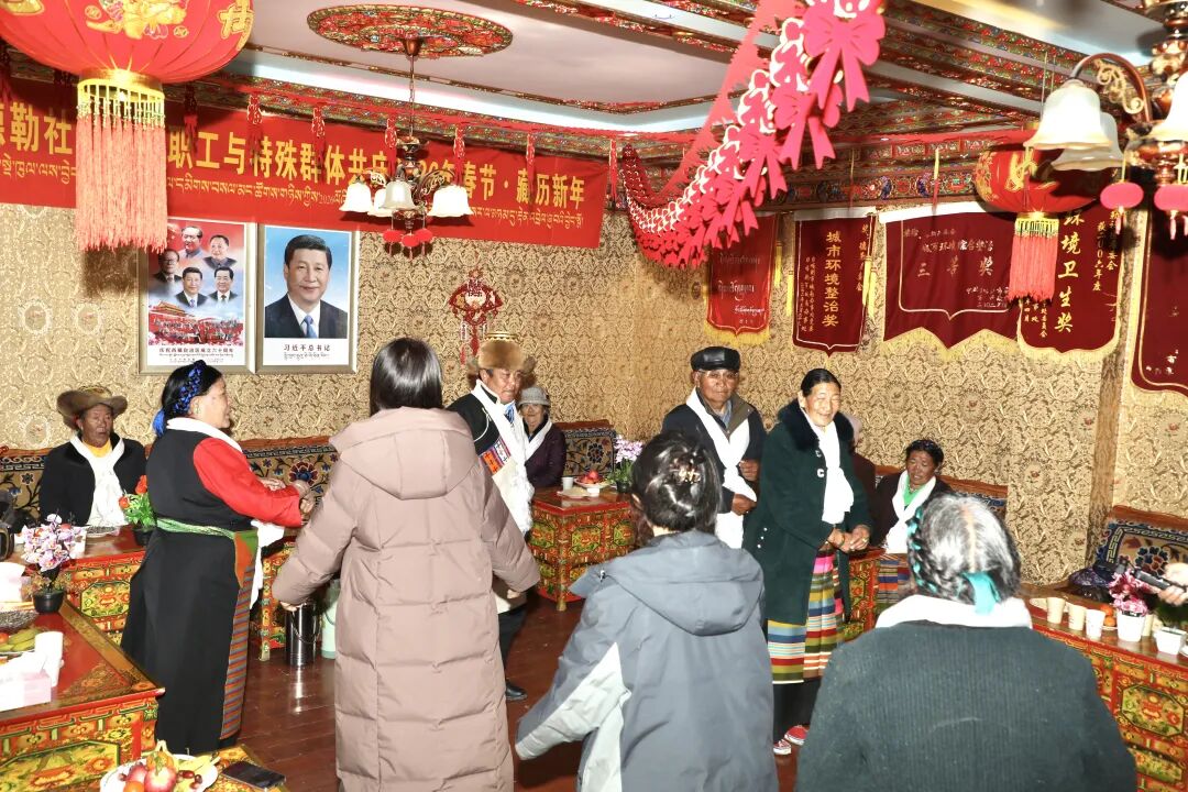 活动现场张灯结彩、年味十足,社区精心布置场地,悬挂大红灯笼、吉祥彩饰与藏式纹样,室内藏式彩绘家具与传统装饰交相辉映,处处洋溢着欢乐喜庆的气息。社区干部职工与特殊群众围坐在一起,拉家常、问冷暖、送祝福,详细了解大家的身体状况、生活困难与实际需求,耐心讲解惠民政策与帮扶措施,用真诚交流拉近心与心的距离。