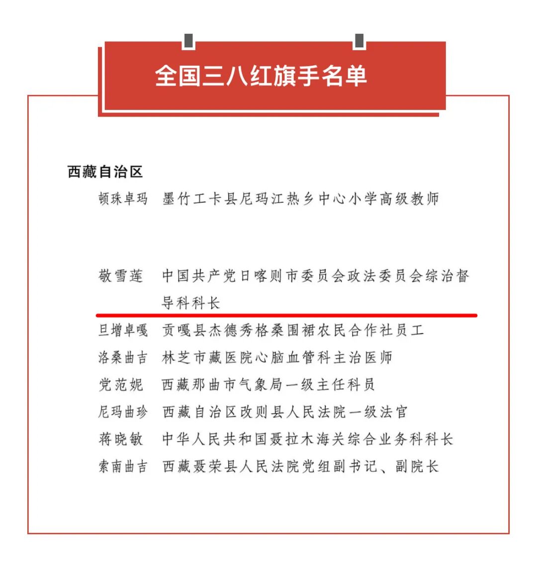 初心不改,使命在肩;芳华绽放,步履不停。敬雪莲以女性独有的细腻、坚韧与担当,在雪域高原的政法一线默默耕耘、奋勇争先,用坚守诠释忠诚,用实干书写担当,用奉献点亮初心。她是平安日喀则的守护者,是新时代高原最美巾帼奋斗者!