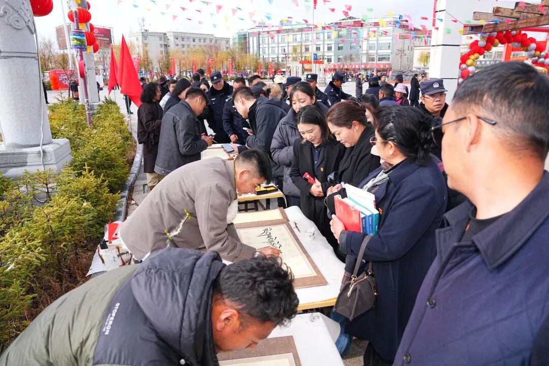 在书法活动展台前,众多群众有序排队等候书法家现场挥毫泼墨。此次参与活动的5位书法家,既有来自“文艺两新”的文艺工作者,也有市美术书法摄影家协会的会员,还有大学生创业书法培训机构的代表。他们以笔寄情、以墨传意,用一幅幅饱含深情的作品,为群众送上真挚祝福。
