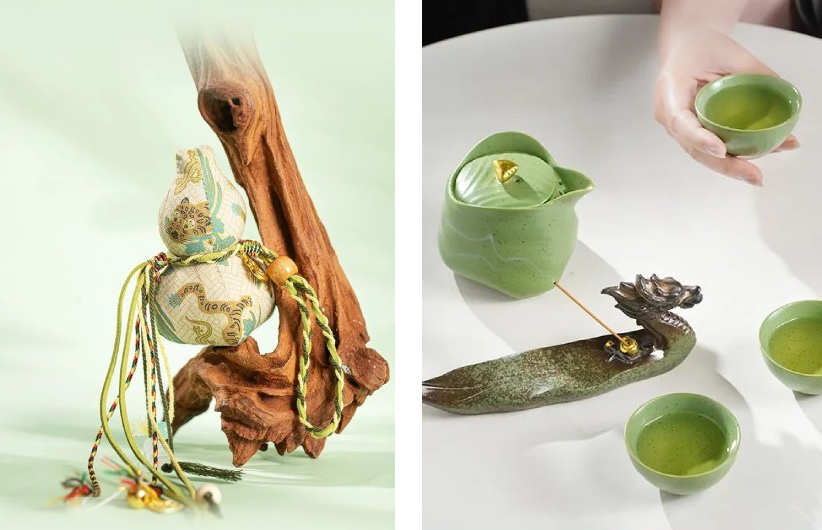 左:国家图书馆“艾虎纳福·福禄端阳艾草香囊挂饰”,右:故宫博物院“龙腾四海·茶具香器套装”