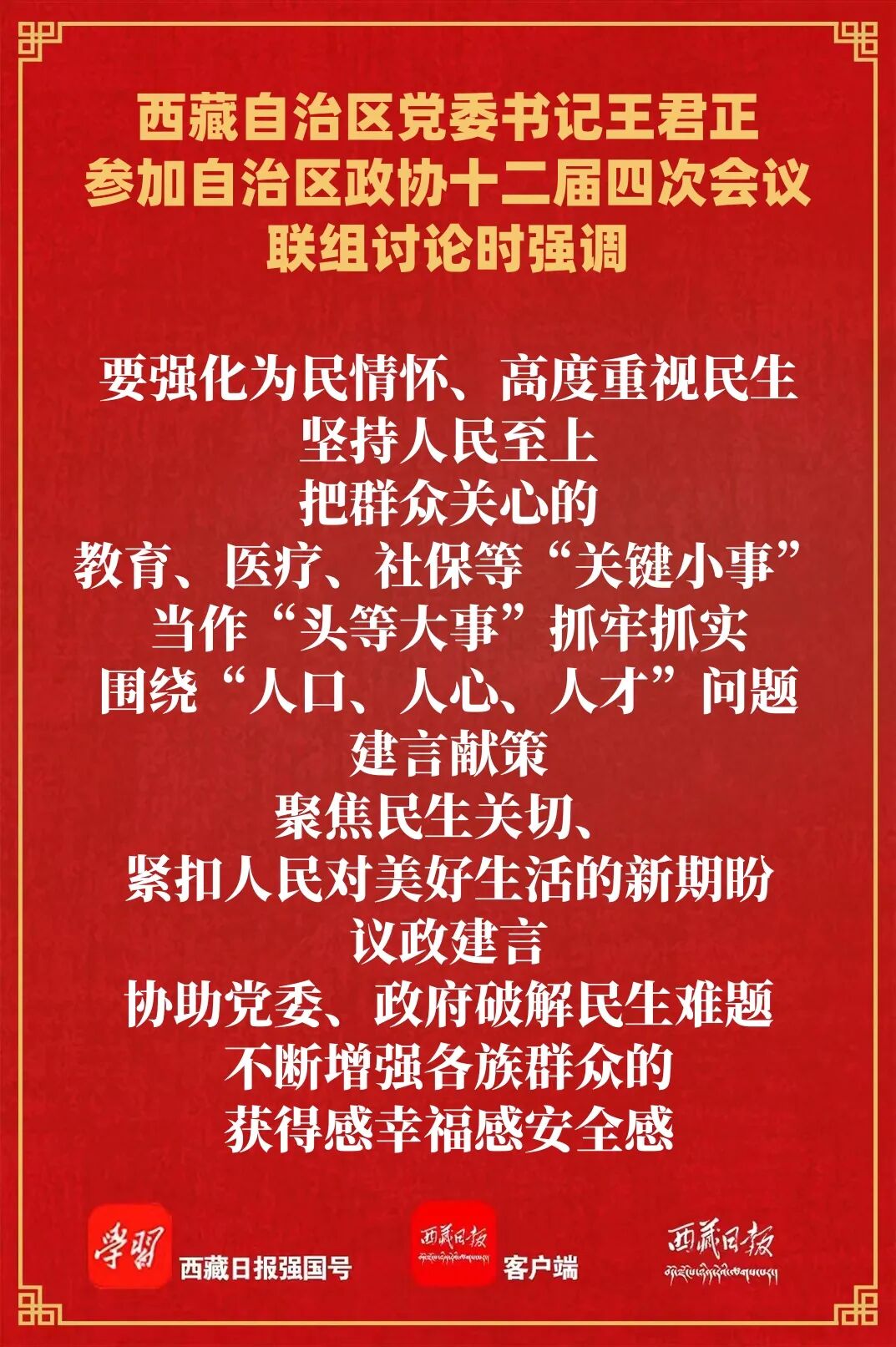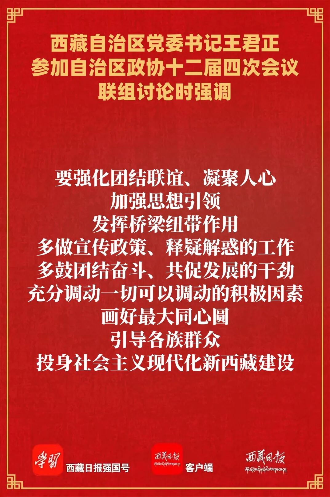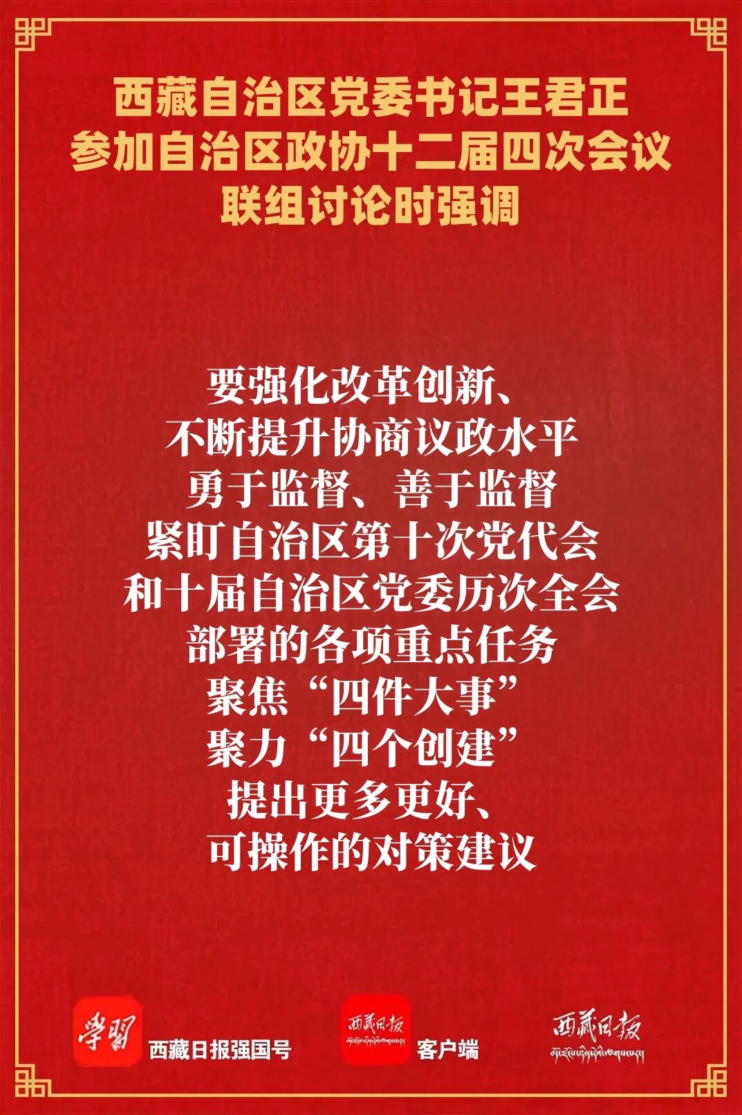 1月30日下午,自治区党委书记王君正参加自治区政协十二届四次会议教育体育界、医药卫生界、社会福利和社会保障界、特别邀请人士界联组讨论。他强调,要深入贯彻落实习近平总书记关于加强和改进人民政协工作的重要思想,全面深刻准确领会和把握党的二十届四中全会精神,认真贯彻落实习近平总书记关于西藏工作的重要指示和新时代党的治藏方略,充分发挥政协组织和政协委员作用,不断提高政治协商、民主监督、参政议政水平,为西藏长治久安和高质量发展贡献智慧和力量。