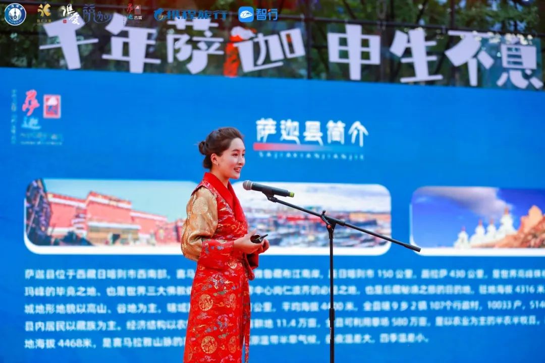 萨迦的文化,多姿多彩;萨迦的人民,能歌善舞。不善言辞的萨迦总是把感谢和祝福都藏在歌舞里。活动在一段充满藏族风情的《高原旋风》舞蹈中拉开序幕,萨迦艺术团现场热情洋溢地带来了《雍则绿措》《天路》歌曲演唱、《吉祥索舞》《锅庄》舞蹈表演。通过萨迦县文化和旅游局推介员达娃央宗现场声情并茂的“雪域敦煌 千年萨迦”旅游推介,让在场来宾和观众全面了解了萨迦的旅游资源和独特玩法,引发了他们对萨迦的浓厚兴趣。