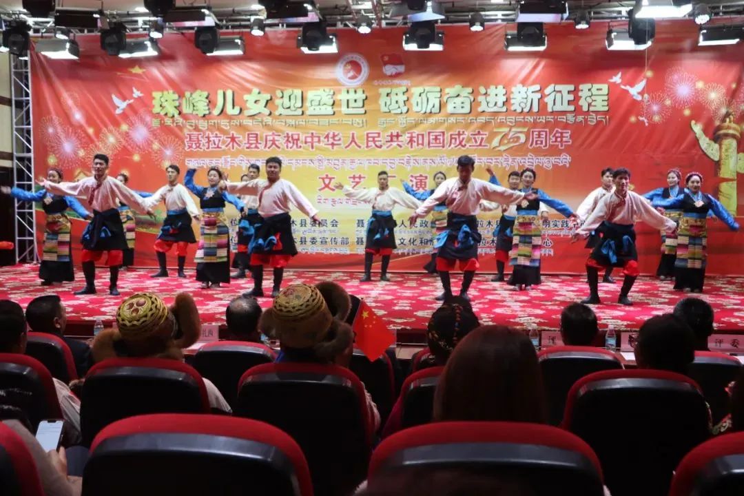 聂拉木县在群众文化活动中心举行“珠峰儿女迎盛世 砥砺奋进新征程”庆祝中华人民共和国成立75周年文艺汇演。演出节目形式多样,精彩纷呈,热情讴歌新中国成立75年来经济社会发展取得的光辉成就,充分表达了全县广大干部群众坚定不移听党话、矢志不渝跟党走的坚定信念和对伟大祖国的礼赞与祝福。