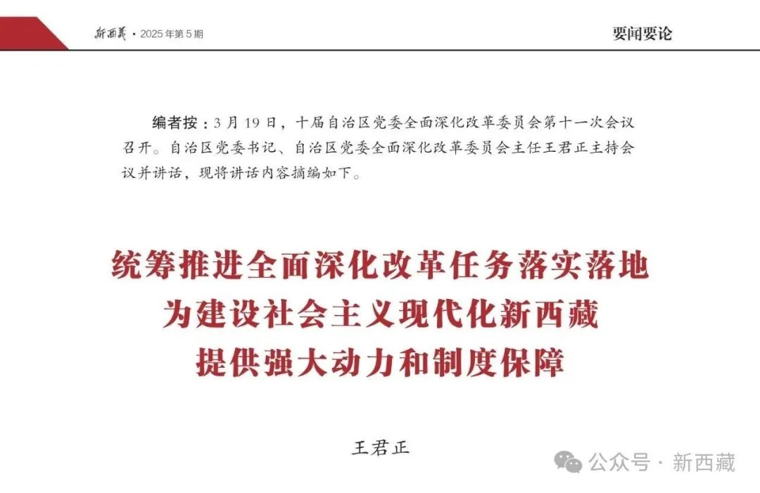 2025年第5期《新西藏》杂志刊发西藏自治区党委书记王君正2025年3月19日在十届自治区党委全面深化改革委员会第十一次会议上的讲话内容摘编。全文如下: