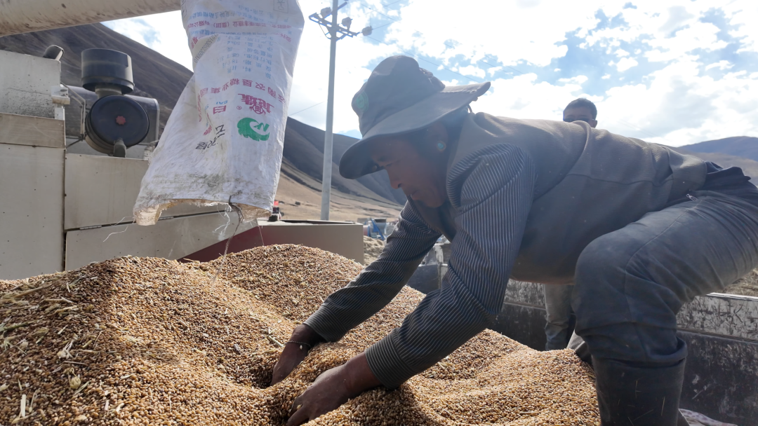 “以前用镰刀割青稞,手上全是水泡,现在合作社的机器一来,我们只需要等着装粮就行。”琼次仁摸着装满麦粒的麻袋,语气里满是感激,“这不仅是省了力气,更是保住了我们的活命钱!”