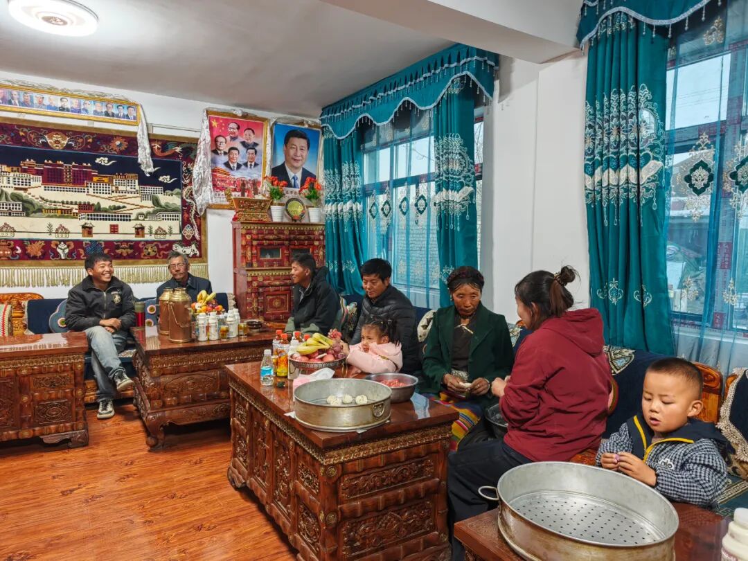 村民次旦家的新屋里,炉火燃得正旺,橘红色火光映得满室温馨:女主人在实木餐桌旁揉面,雪白的面团在掌心翻折、捏合,不多时,一个个圆鼓鼓的包子便整齐码在托盘上;男人们坐在一旁,一边帮忙一边闲聊,话题从今年青稞的收成,慢慢聊到明年外出务工的计划,笑声不时与炉火的噼啪声交织;两个孙子孙女举着玩具在屋里嬉闹,清脆的笑声像银铃般在这栋210平方米的新居里回荡。