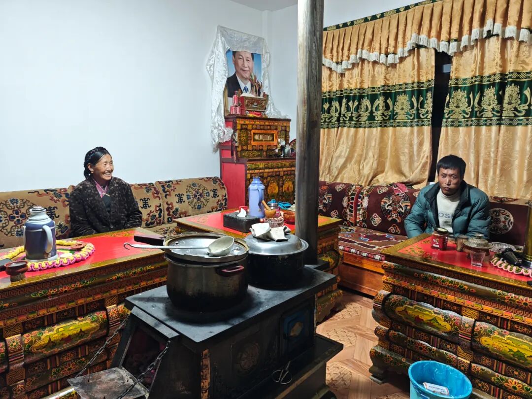 距离扎西平措家不远的巴桑家,炉火同样烧得正旺。巴桑坐在炉边吃着糌粑,炉子上的骨头汤咕嘟咕嘟冒着泡,肉香混着青稞的清香在屋里弥漫。