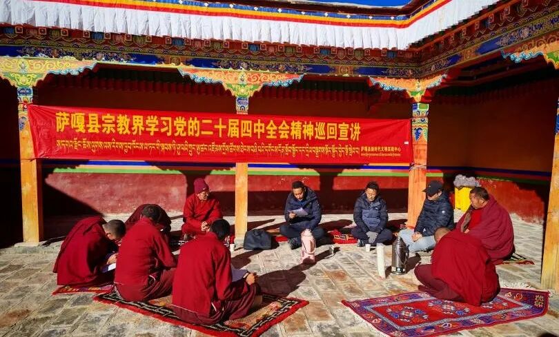 萨嘎县委宣传部、统战部联合组建宣讲队,走进全县各寺庙,用通俗语言和鲜活案例讲清讲透公报核心内容,引导广大僧尼认真学习领会党的二十届四中全会精神,继承发扬爱国爱教优良传统,铸牢中华民族共同体意识,增进“五个认同”,确保全会精神在内化于心、外化于行上取得更大成效。
