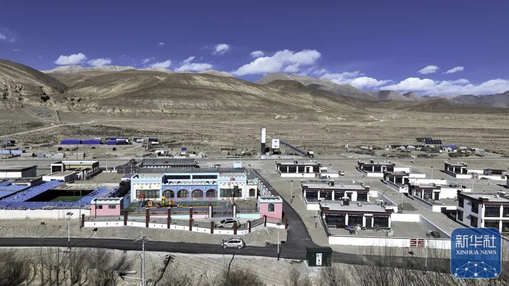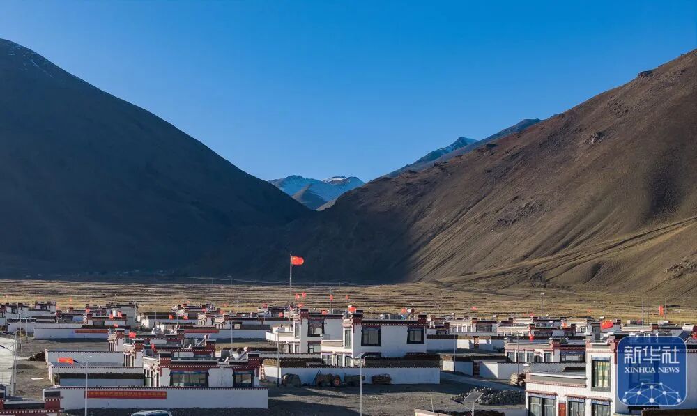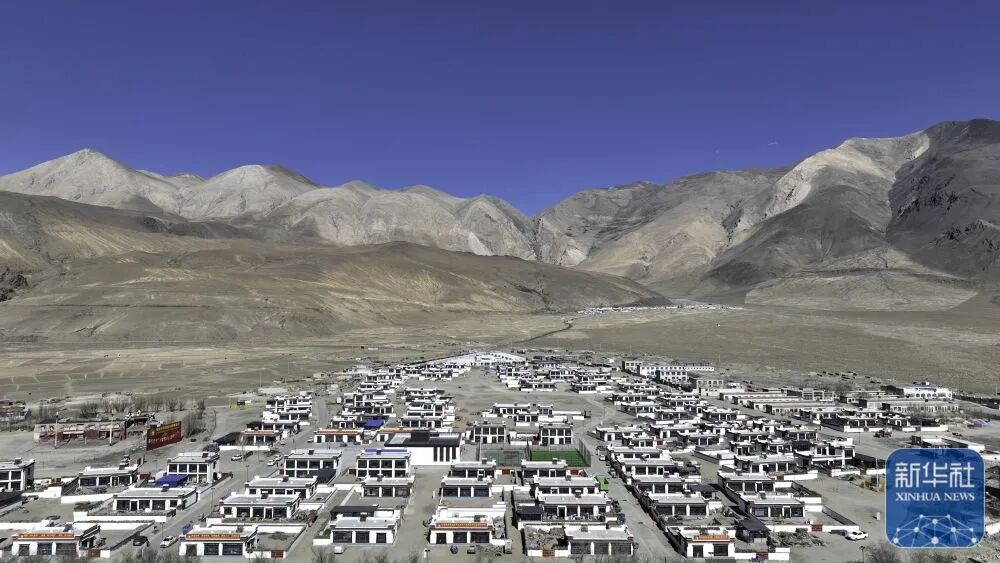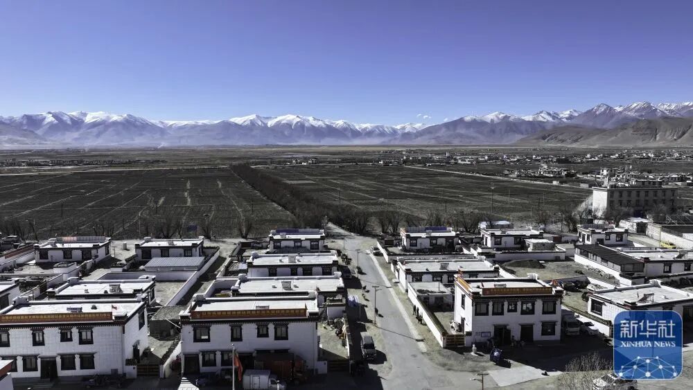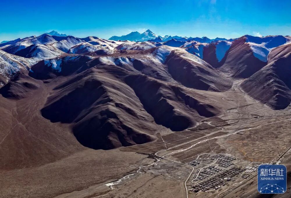 珠穆朗玛峰脚下的西藏定日县措果乡野江村,靠近珠峰方向为建成并交付群众使用的新房(无人机照片)。新华社记者 姜帆 摄