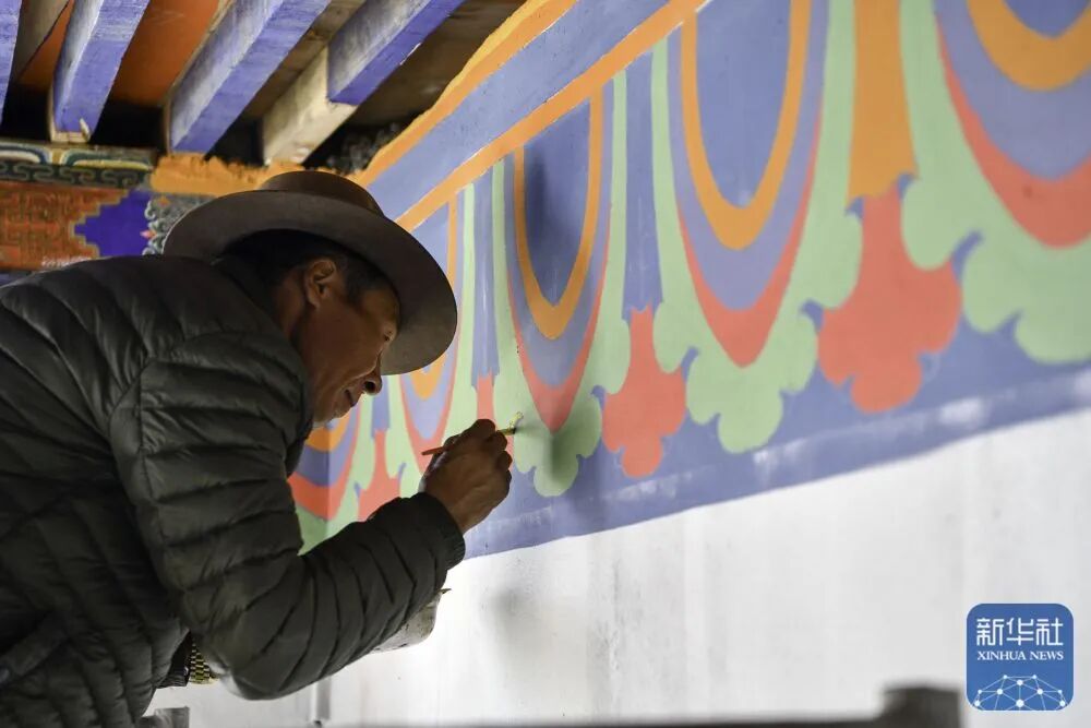 西藏拉孜县锡钦乡朵玛村村民画壁画装饰自家新居。新华社记者 丁洪法 摄