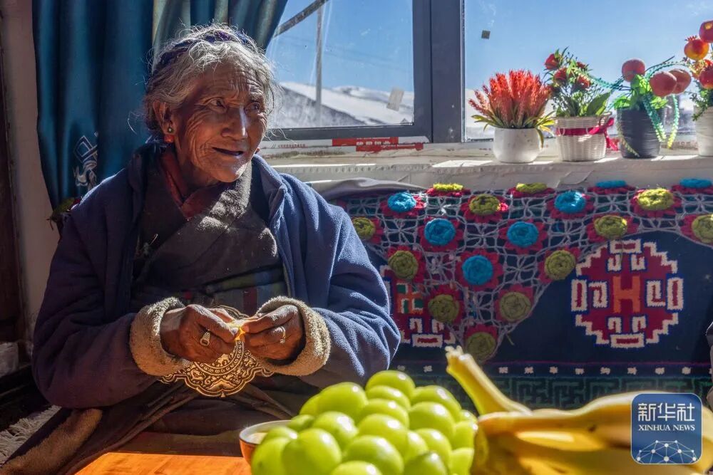 西藏定日县盆吉乡恰巴村74岁老人益西桑姆在自家的新房中。她所在的珠堆自然村海拔5200米,是此次灾后重建中海拔最高的工区。新华社记者 姜帆 摄