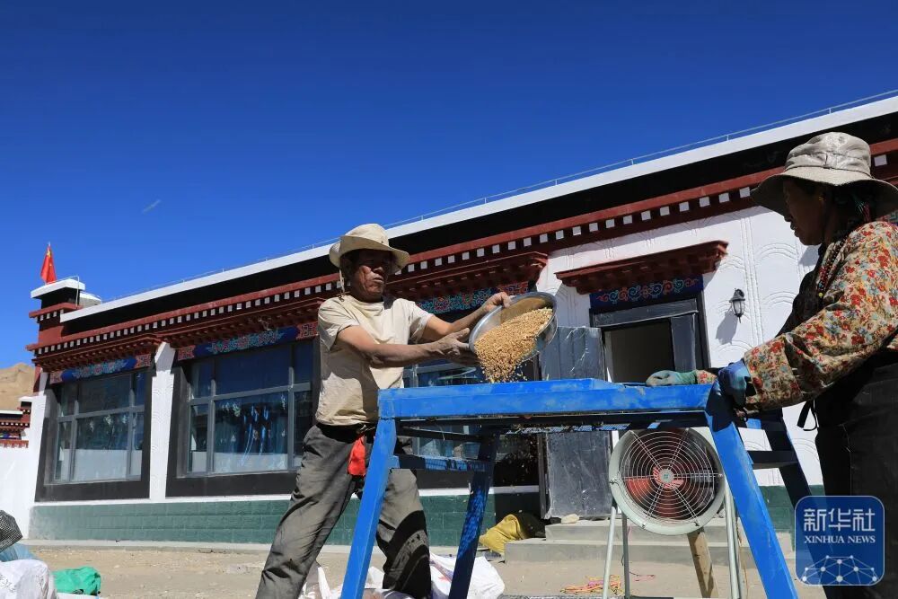 西藏定日县曲洛乡措昂村村民旦增(左)在自家新房院子里加工收获的青稞。新华社发(陈小军摄)