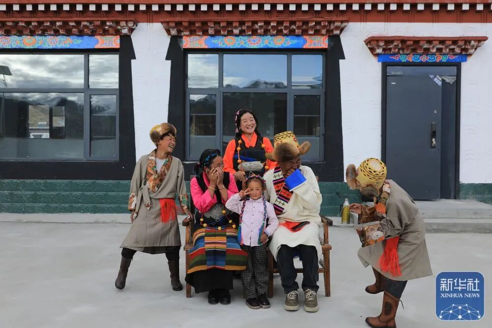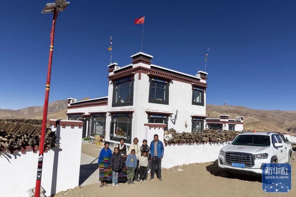 西藏定日县曲洛乡措昂村村民达瓦卓玛(后中)一家在新房前准备拍摄“全家福”。新华社发(陈小军摄)