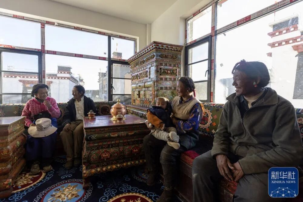 西藏定日县加措乡加布村村民强琼(左二)在自家新房中招待乡亲。新华社记者 姜帆 摄
