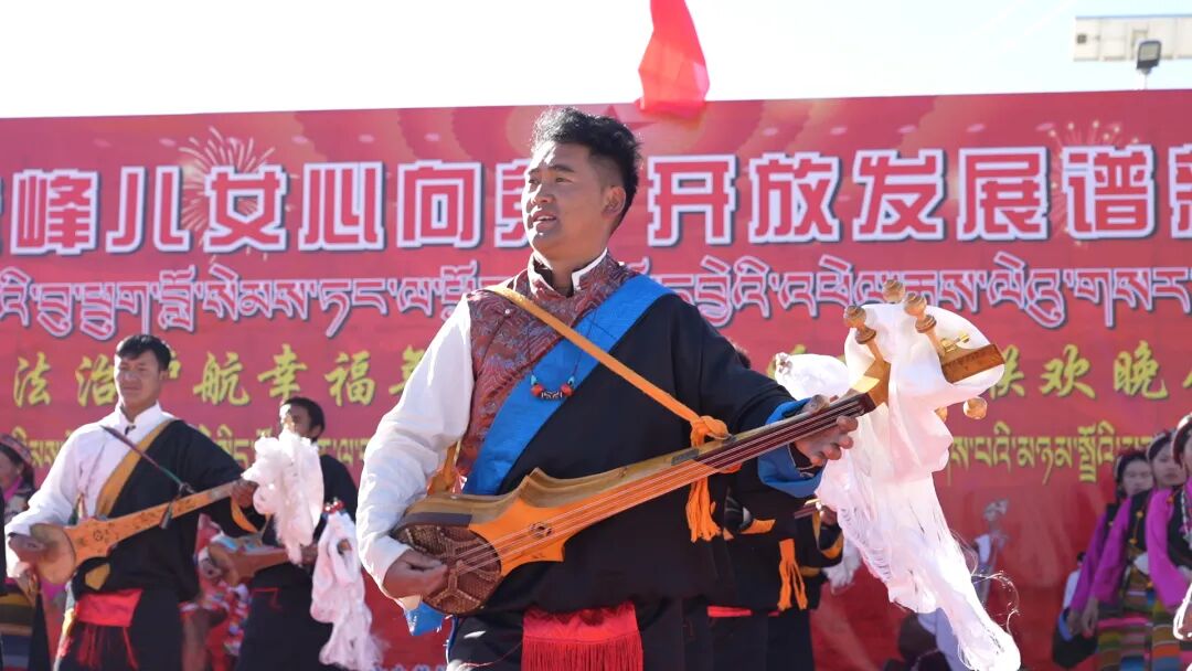 村委会的舞台前早已人头攒动、锣鼓喧天,一场由拉孜县人民政府主办,县委宣传部、县司法局、县普法办共同承办的“村晚”,正热热闹闹开演。演出现场,村民格桑平措作为群众演员代表格外亮眼,他踏着明快吉祥的舞步,手捧扎木念,和同伴们联袂献上《扎堆啦》《拉贵岗日嘎布》等节目,铿锵的节奏、欢快的舞姿,引得台下掌声雷动、喝彩声此起彼伏。