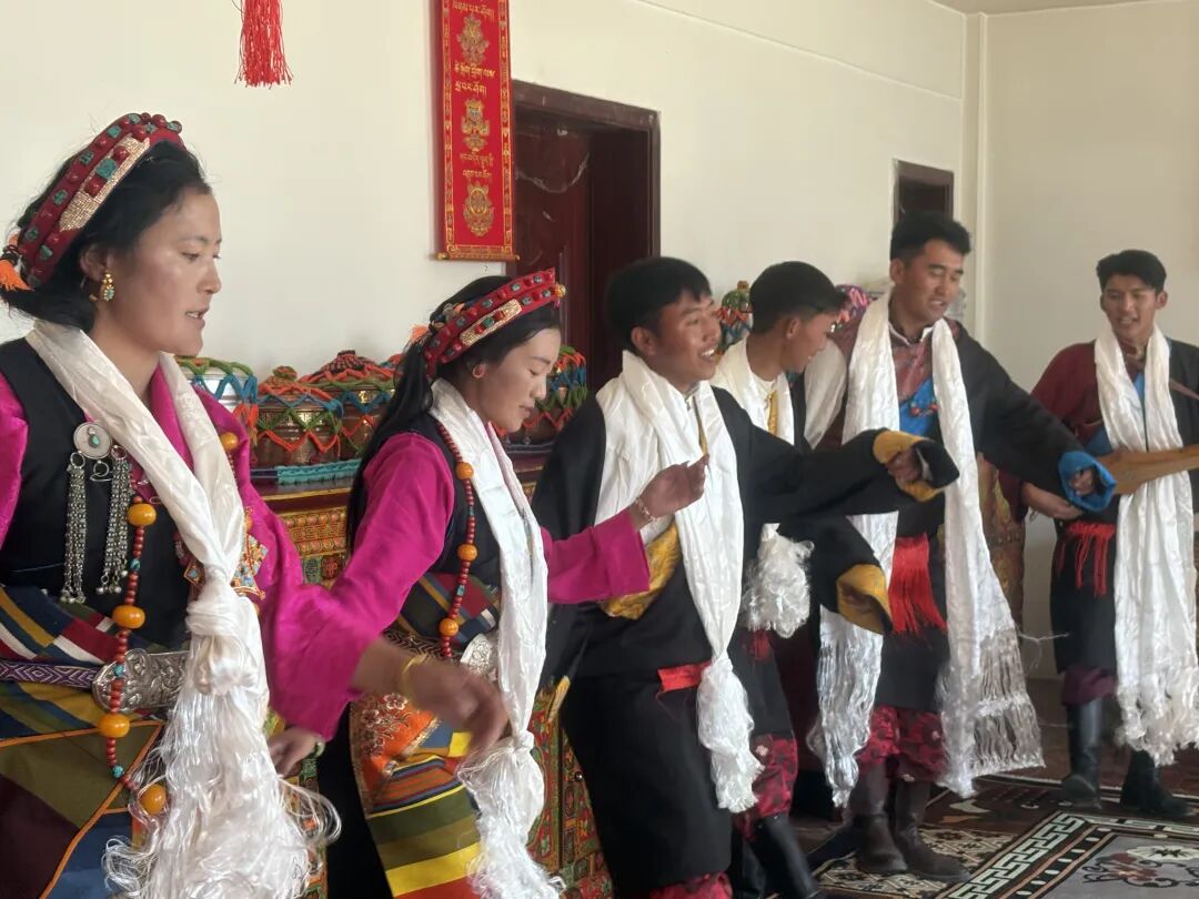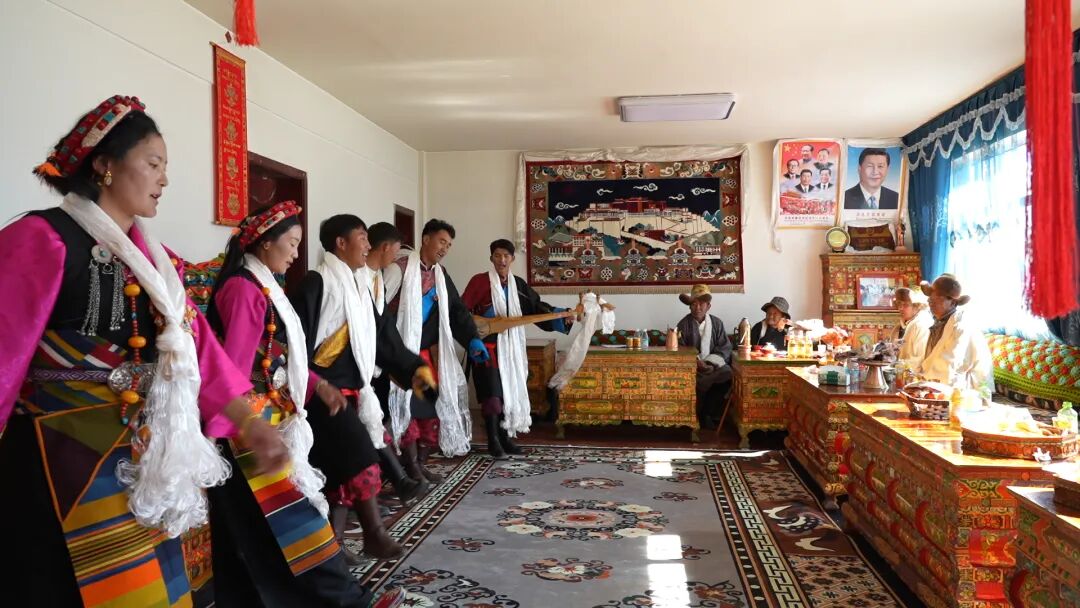 临近晌午,暖融融的阳光透过窗棂洒进屋里,满座宾客举杯同庆,一声声新年的祝福在屋内回荡。格桑平措和一同演出的朋友们兴致愈发高涨,当场载歌载舞——动人的旋律悠扬婉转,欢快的舞步轻盈灵动,踏出了大伙儿对新生活的无限向往。
