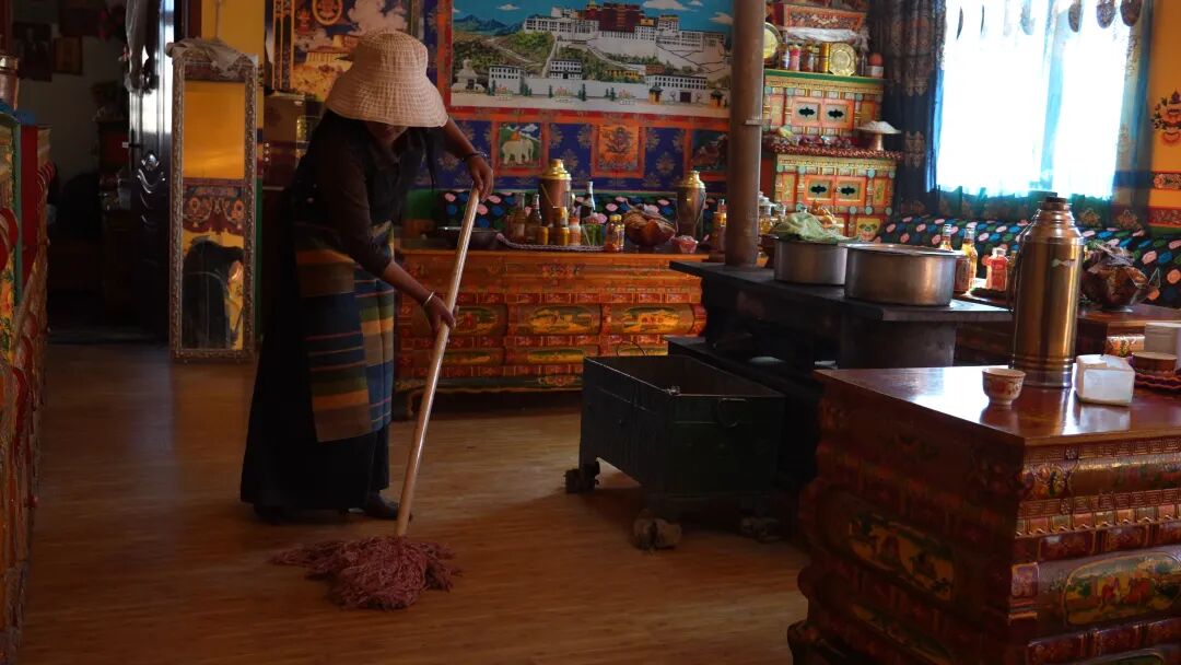 走进索朗家宽敞的院落,浓郁的年味与忙碌的气息扑面而来。新挂的门帘与“香布”在微风中轻轻摆动,灶火正旺,一口大锅正炖煮着羊头,汤汁已熬成奶白色,热气裹着浓香弥漫开来。