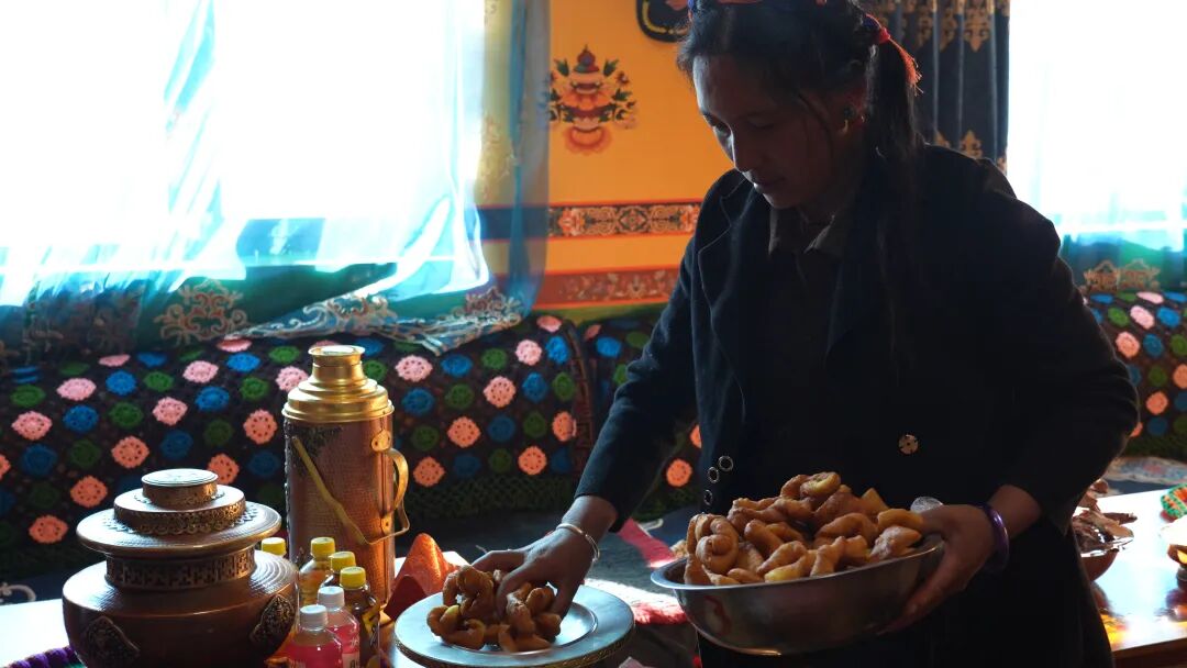 炸完新年必备的 “卡塞”,卓嘎转身便开始装点客厅,她将象征五谷丰登的“切玛”郑重安放于崭新的藏式柜上,随即风干肉、各色糖果饮料、刚出锅的“卡塞”一一摆上桌案,铺展开崭新的卡垫。顷刻间,客厅里便被满满的年节气氛包裹,暖意融融。
