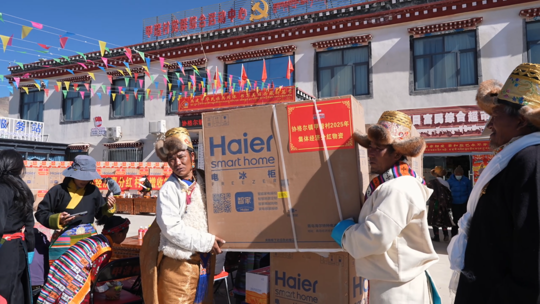 在定日县协格尔镇甲谐村集体经济分红现场,分红资金和一台台崭新的冰柜、打茶机整齐陈列。村民们按照顺序,依次领取分红并相互祝贺,分享收获的喜悦。