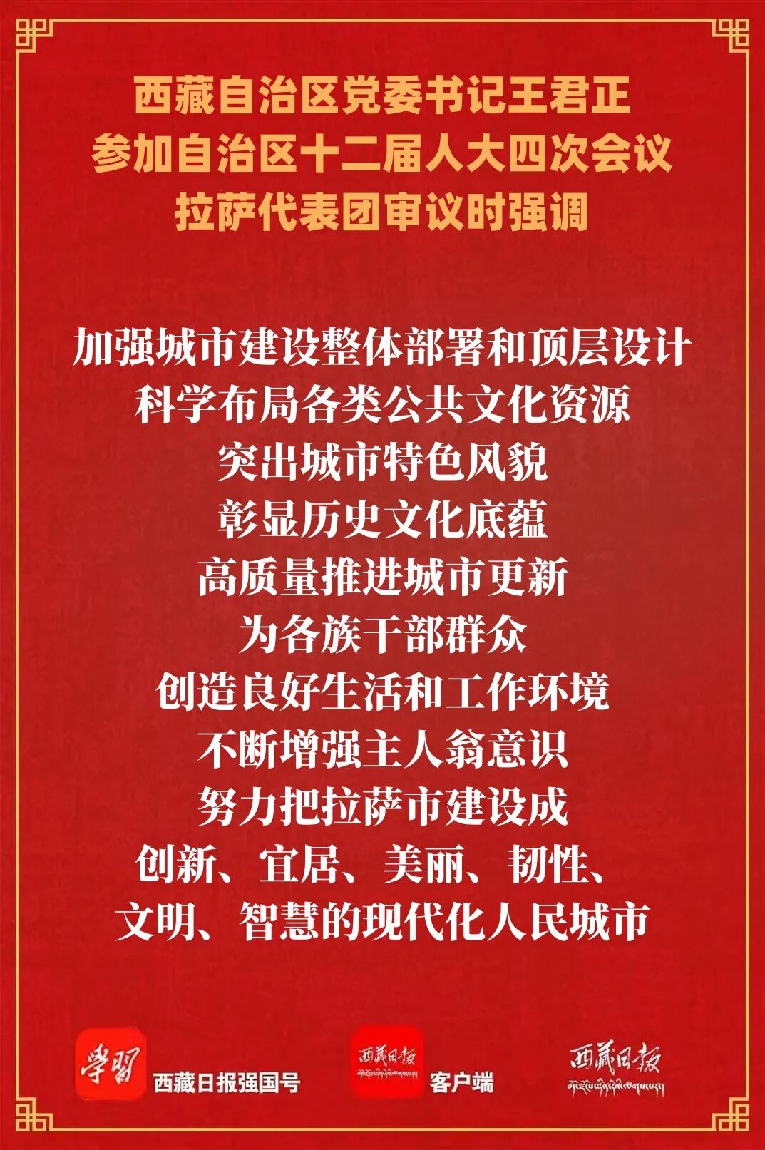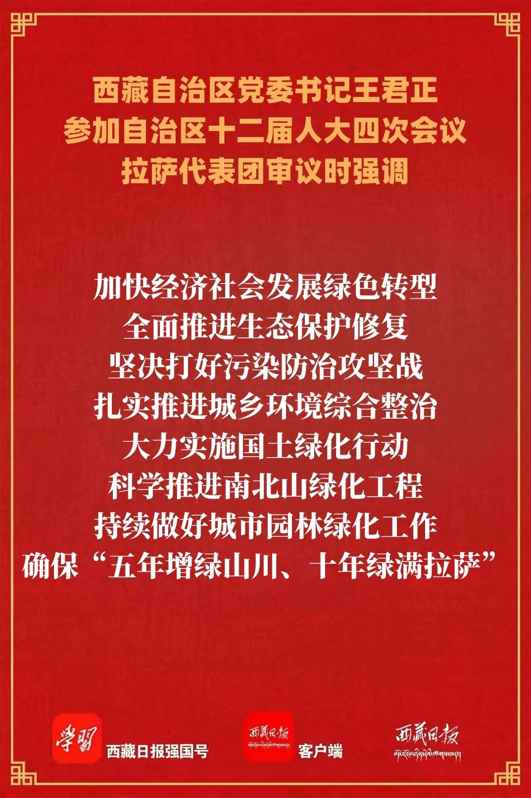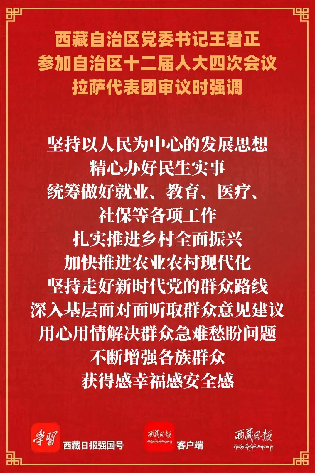 1月31日,自治区党委书记王君正参加他所在的自治区十二届人大四次会议拉萨代表团审议时强调,要全面深刻准确贯彻落实党的二十届四中全会精神,深入贯彻习近平总书记关于西藏工作的重要指示和新时代党的治藏方略,为“十五五”开好局起好步当好全区长治久安和高质量发展排头兵,努力为社会主义现代化新西藏建设作出更大贡献。