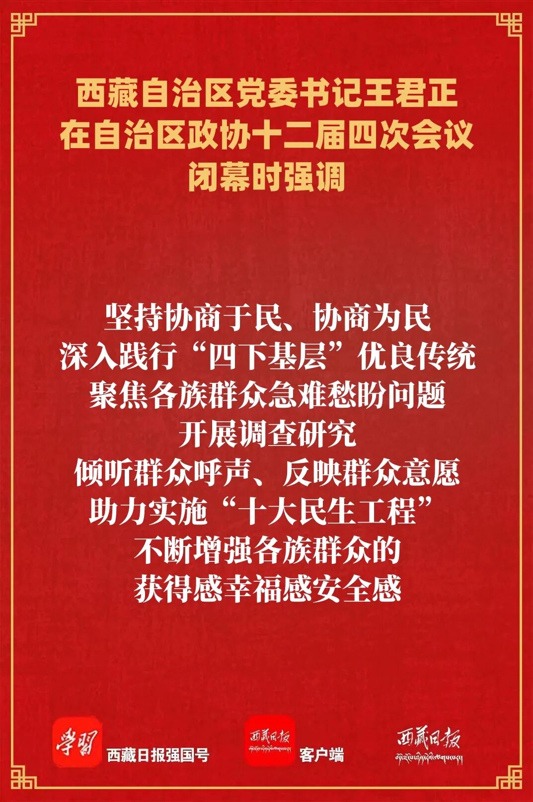 王君正强调,要坚持党对政协工作的全面领导,确保政协事业始终沿着正确政治方向前进。把坚持党的全面领导落实到工作谋划、职能履行、自身建设等各方面和全过程,善于把党的主张转化为各族各界的政治共识和自觉行动,推动习近平总书记重要指示和党中央决策部署在雪域高原落地生根、开花结果。要坚持不懈用习近平新时代中国特色社会主义思想凝心铸魂,巩固团结奋斗的共同思想政治基础。深入学习党的创新理论特别是习近平总书记关于加强和改进人民政协工作的重要思想,自觉用以武装头脑,推动各族各界人士进一步实现政治上团结合作、思想上共同进步、行动上步调一致。要紧紧围绕党委中心工作履职尽责,积极为建设社会主义现代化新西藏献计出力。坚持把政协工作置于西藏工作大局中思考谋划推动,围绕“四件大事”落实、“十五五”规划实施,深入推进协商议政,提出有针对性、可操作性的对策建议,着力加强民主监督,切实做到协商有方、监督有力、参政有为。要坚持人民政协为人民,努力在改善民生、凝聚人心上积极作为。坚持协商于民、协商为民,深入践行“四下基层”优良传统,聚焦各族群众急难愁盼问题开展调查研究,倾听群众呼声、反映群众意愿,助力实施“十大民生工程”,不断增强各族群众的获得感幸福感安全感。要广泛凝聚社会共识,形成心往一处想、劲往一处使的良好局面。进一步加强思想政治引领,丰富协商形式,拓宽协商深度,当好团结社会各界的桥梁纽带,画好最大同心圆,积极引导各族群众铸牢中华民族共同体意识、不断增进“五个认同”,共同推进社会主义现代化新西藏建设。要加强自身建设,不断提升政协工作制度化、规范化、程序化水平。健全深度协商互动、意见充分表达、广泛凝聚共识的机制,持续提高思想认识和履职本领,当好专门协商机构的参与者、实践者、推动者,更好把人民政协制度优势转化为治理效能。