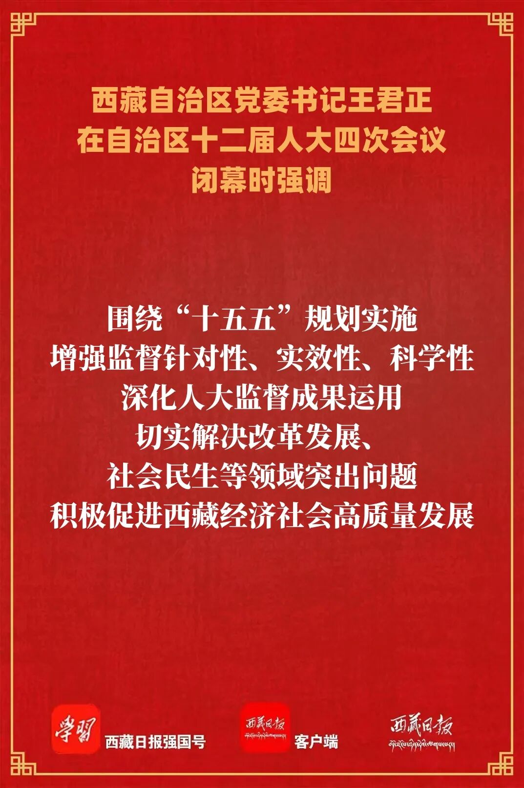 王君正指出,自治区十二届人大四次会议是一次实干兴藏、奋战开局、共谋新篇的大会。会议审议通过的“十五五”时期西藏自治区国民经济和社会发展规划纲要,深入贯彻了党的二十届四中全会精神,全面贯彻了习近平总书记关于西藏工作的重要指示和新时代党的治藏方略,把习近平总书记为西藏擘画的宏伟蓝图细化为“十五五”时期的具体目标任务,实化为确保“十五五”开好局起好步的各项工作举措,充分彰显了中国特色社会主义制度优势,集中体现了全区各族人民对美好生活的期盼向往,吹响了启航“十五五”、迈向新征程的奋斗号角。全区各级各部门和广大干部要深刻领悟“两个确立”的决定性意义,增强“四个意识”、坚定“四个自信”、做到“两个维护”,按照本次会议确定的目标任务,以高度的政治责任感和强烈的历史使命感,扎实围绕“四件大事”落实,推动长治久安和高质量发展,真正把宏伟蓝图变为美好现实。