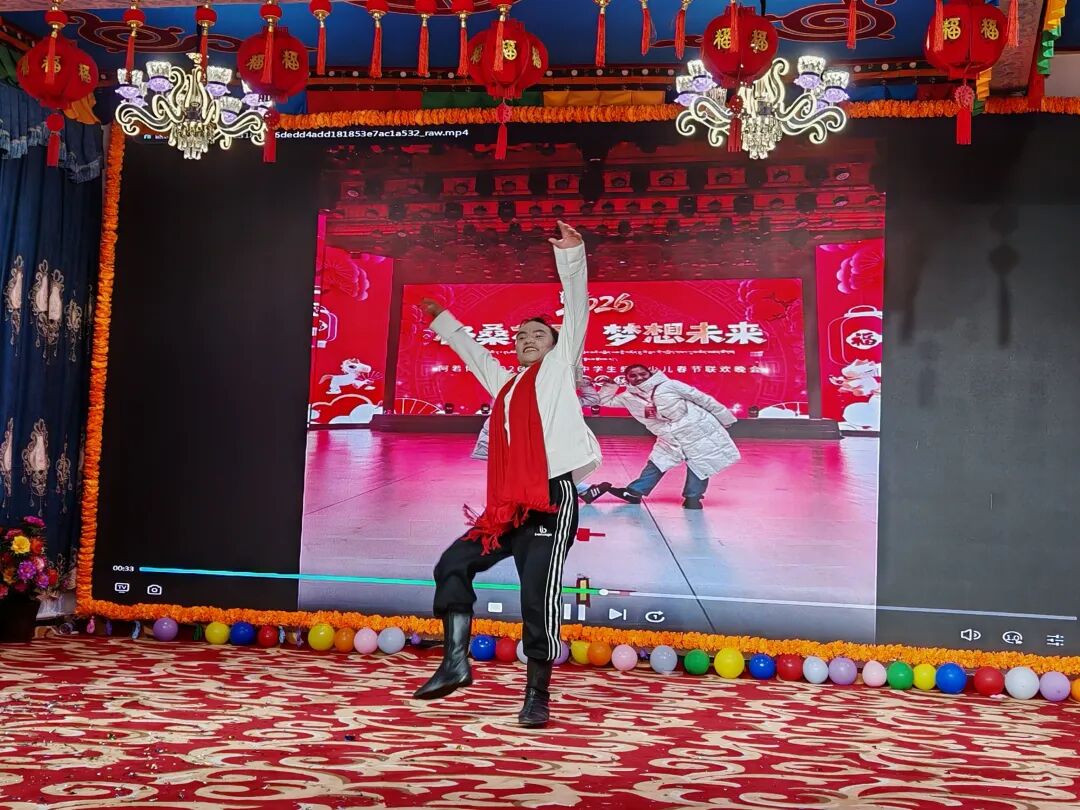 在本次联欢会上,备受大家关注与呵护的孩子顿珠,带来了独舞《牛背上的摇篮》。他舞姿优美舒展、情感真挚,用干净纯粹的表演打动了全场,收获了阵阵热烈掌声。演出结束后,在现场采访中,顿珠真诚地说道:“感谢所有帮助过我的人,我一定会好好努力,请大家放心。”质朴的话语,饱含感恩与成长,充满了温暖与感动。